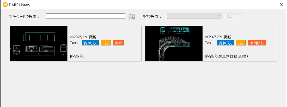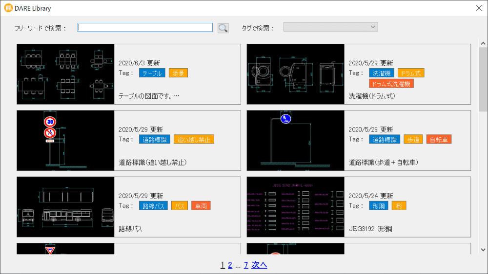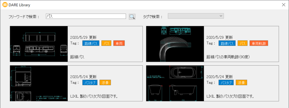 DARE Library ダイアログでは、CAD データ共有サービスで公開されている図面の中から探している図面を検索することが可能です。