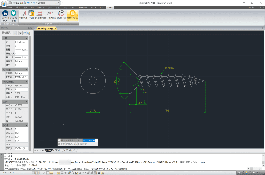 DARE Library ダイアログで図面を検索し、使いたい図面を見つけたらそのままアクティブな図面へ挿入することが可能です。